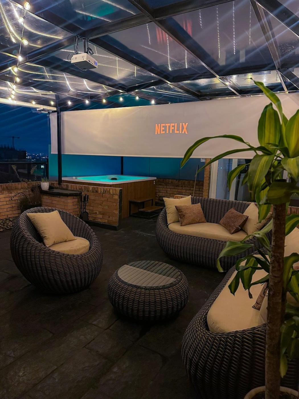 A penthouse with a luxury Jacuzzi and panoramic view