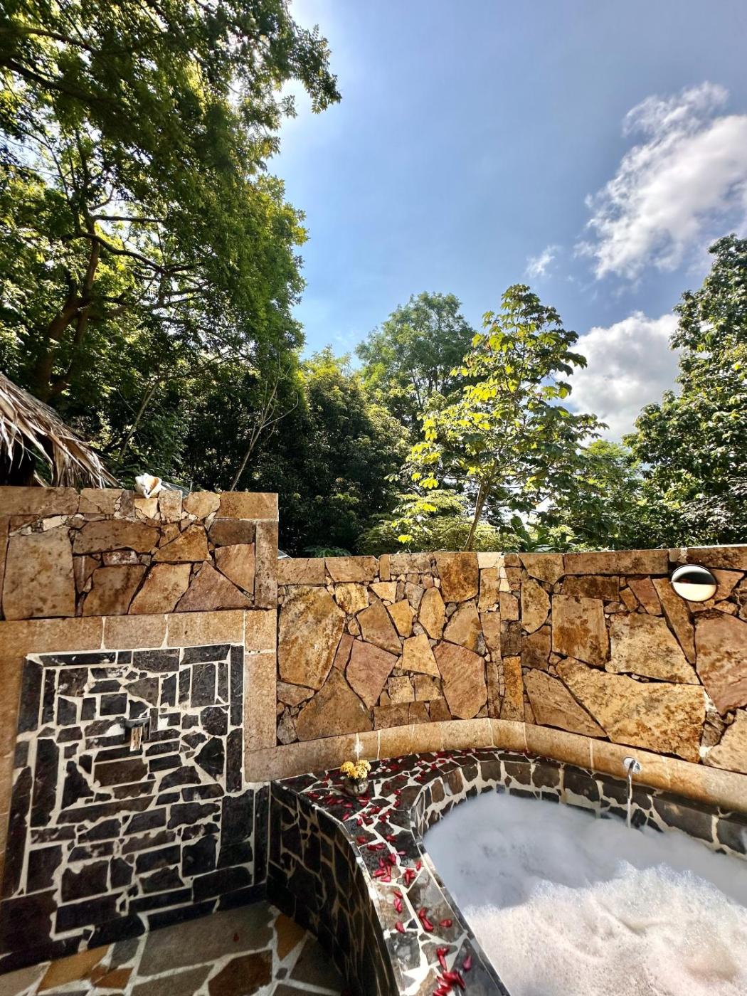 Deluxe Double Room with Balcony. This room has a private bathroom with a hot tub with hot water and a balcony with a hammock, a table and a garden view. ;